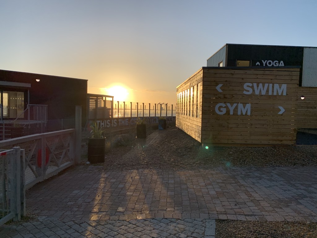 Looking down at the pool from the streets above, it’s presence seems implausible. Almost like it flew in at night and landed on the beach. Being so accustomed to pools in heavy Edwardian and Victorian buildings, this one seemed light as a feather like it could be dismantled overnight and moved. I noticed some of the materials in the changing rooms were made from recycled waste which seemed to fit with the ethos of the construction. The etiquette was laid back. The booking is for an hour but no one was there with a clock to say times up. The friendly staff at the desk let me start my swim earlier than my booking on the app. There’s a shoes off policy as you enter the mixed changing room which I initially missed, but I appreciate how this policy encourages people to come together at the entrance to take shoes off or put them on which inevitably provides a chance for conversations. Lockers require you to bring your own lock which caught me out. The changing room is no frills with an emphasis on function done in a lean style. Showers are hot, but it is one temperature only and no place to put glasses etc. This is really not a problem as no one is expecting to lounge in the changing rooms. Similarly, some website reviewers have complained about standing water on the floors in the changing room, but this doesn’t strike me as a big issue especially on the day that Debi doing her best to blow the whole infrastructure off the beach itself. Also, the number of swimmers with wetsuits means that there will be lots of water in the changing rooms.